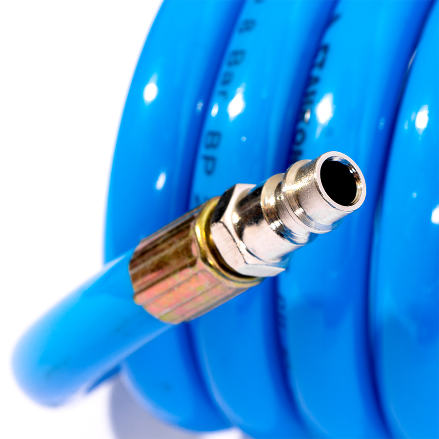 Шланг воздушный спиральный применяется для подачи воздуха от компрессора или линии сжатого воздуха к пневмоинструменту. За счет своей формы в виде спирали, шланг имеет достаточно компактный размер и не мешается под ногами.